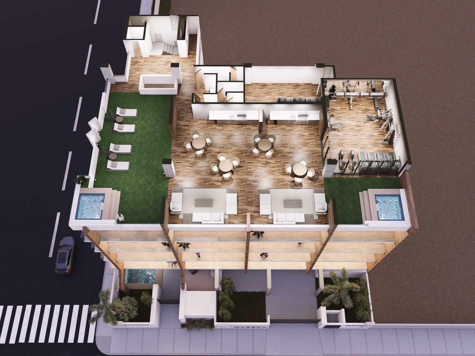 El Sky Deck de Marena es el corazón social del desarrollo, ubicado en el rooftop con las mejores vistas panorámicas de La Paz. Este espacio exclusivo combina relajación, entretenimiento y bienestar en un ambiente de lujo absoluto, donde el cielo se encuentra con el mar.